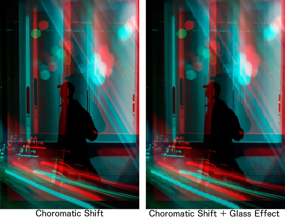 Left: Chromatic Shift only. The intentional misalignment of the neon red and blue emphasizes the cyberpunk atmosphere. Right: + Glass Effect. The texture of raindrops running down a windowpane is added on top of the colors, creating an even more emotional expression.